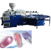 PVC Air Blowing Injection Machine 1 PLC program control of industrial man-machine interface\Display of tactile screen\Quick speed Precise measurement\Full automatic operation. 2 Equipped with mould-cooling device to raise the quality and productivity,excellent efficiency in cooling. 3 Equiped with blowing system,reduce the pollution.The products would be lightweight,soft and with a shinning surface. ItemsUnitsKR8024-C1MaterialkindPVCMould stationsstations24Injection capacity (Max.)g800 Injection measuring accuracyg0.5Injection pressurekg/cm2760Diameter of screwmm75Rotate speed of the screwr/min1-160Clamping pressurekn700Mold sizemm500*500*230Temperature Controlpoint4*1Hydraulic pressurempa21*1Opening stroke of mouldmm300Oil tank capacitykg450Outputx/h1-300Power systemPower of heating platekw9*1Power of motorkw18.5*1Total power kw27.5Dimension(L*W*H)M3.8*3.8*2.5Machine WeightT5.7